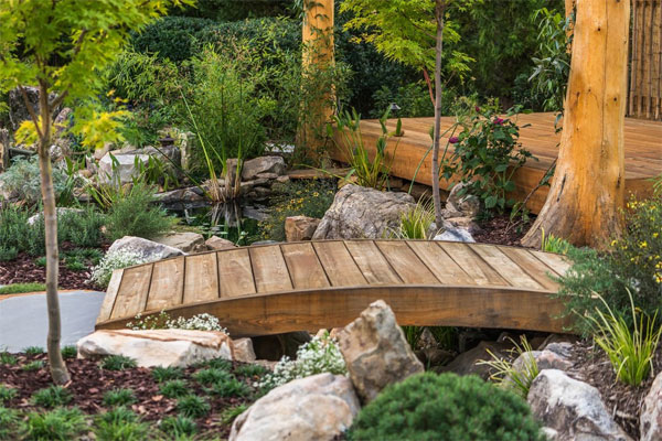 在你的小院有一个弧形小木桥,可以成为引人注目的焦点。弧形小木桥一般是用来搭配水景的,它可以快速让你获得园林意境感受。对于水系,你既可以采用真实的水,也可以采用日式的枯山水,通过散置砾石来代替真正的水质。无论哪种方式,小木桥都会成为吸引目光的好地方。弧度不宜太高,这样会影响行走,也不宜取直,因为直线会缺失意境品味,也同样意味着底部空间需要过度的下挖。